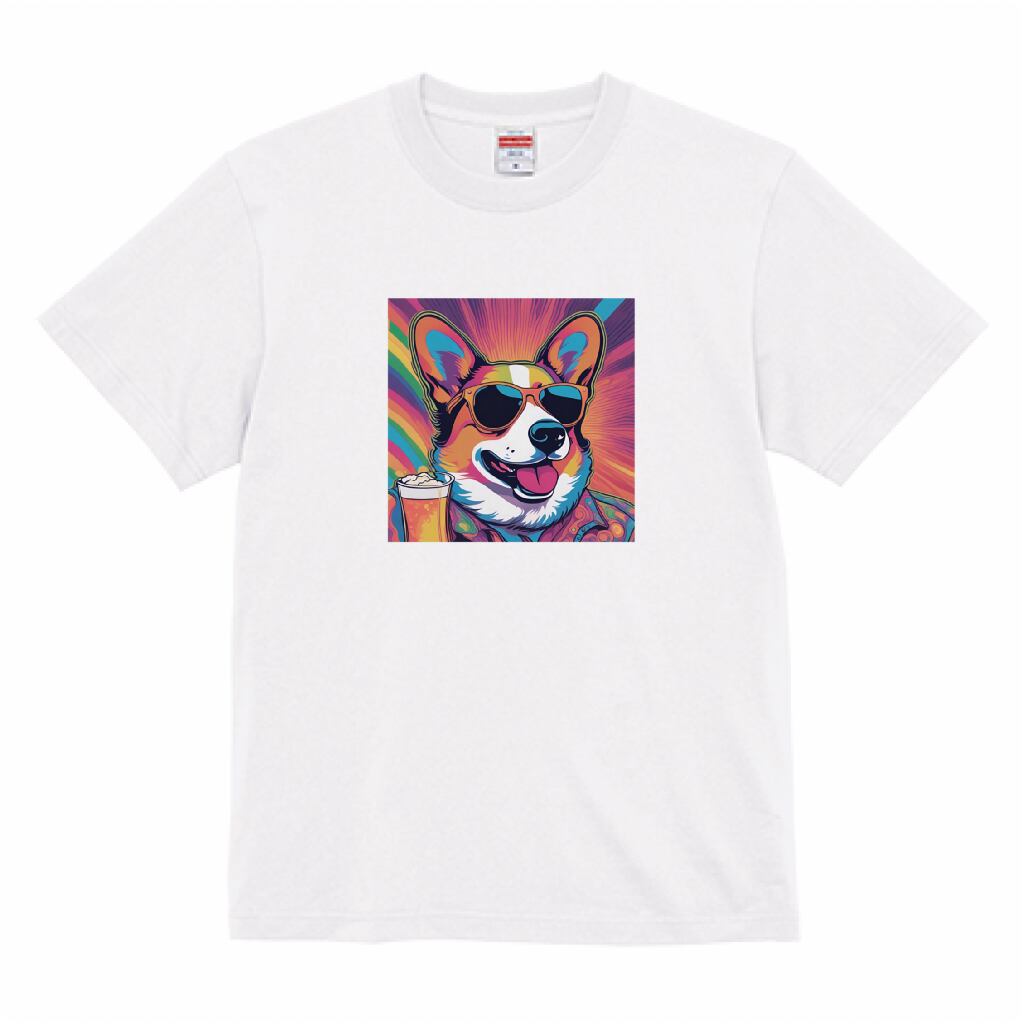 サイケデリックな「TGIFコーギー」Tシャツ。
