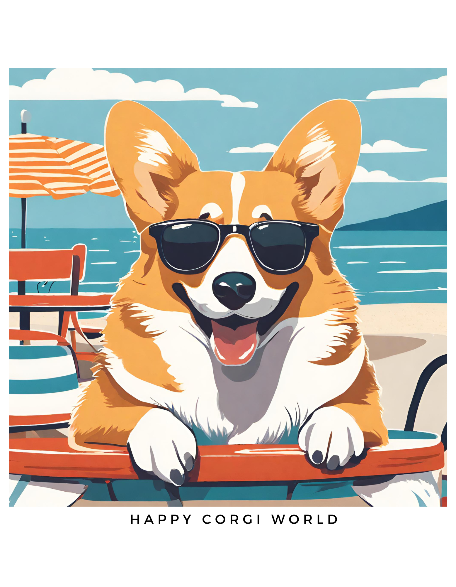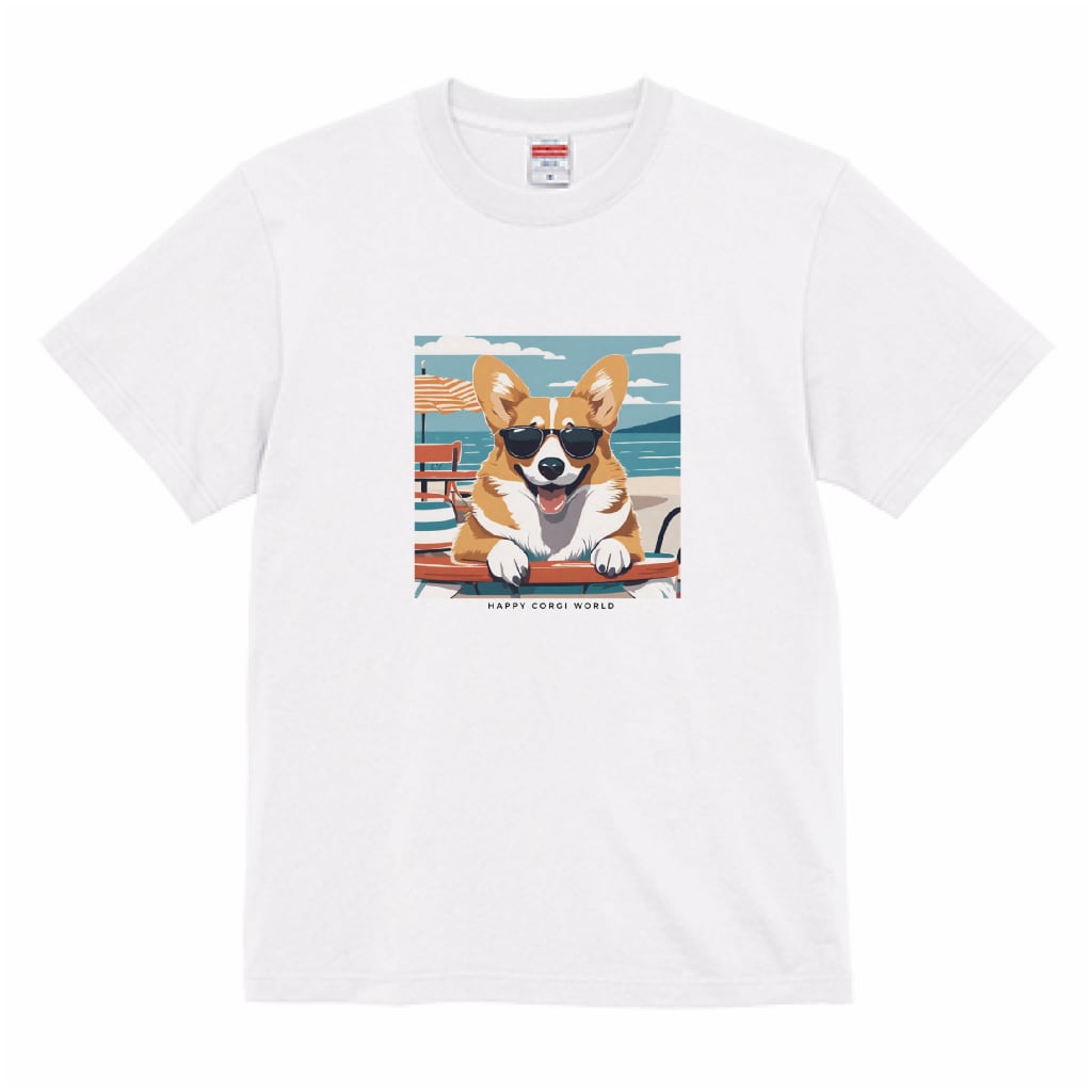 海辺でのんびり「シーサイドコーギー」Tシャツ。