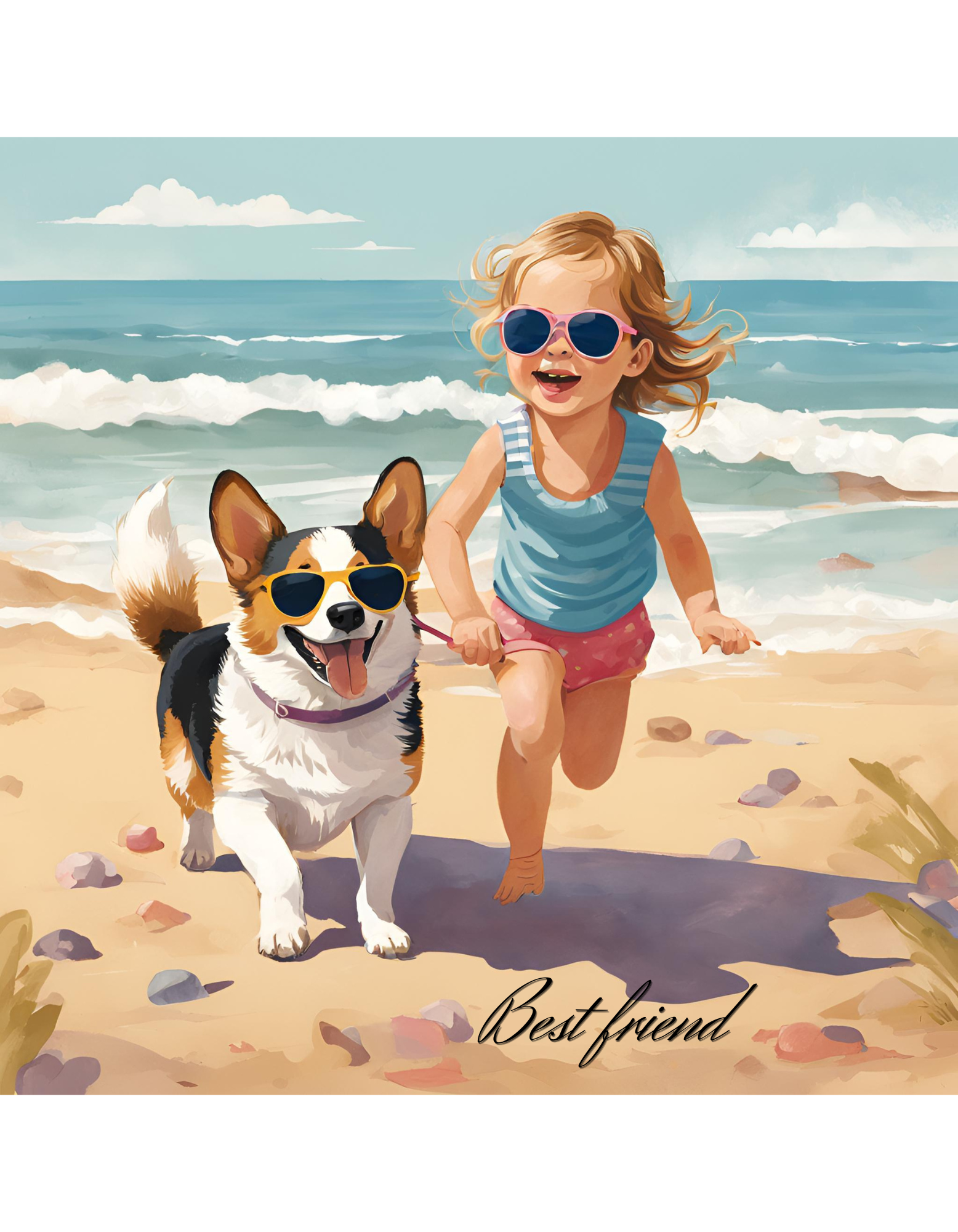 コーギーと女の子が仲良く海辺を走る「ベストフレンズ」のイラストです。